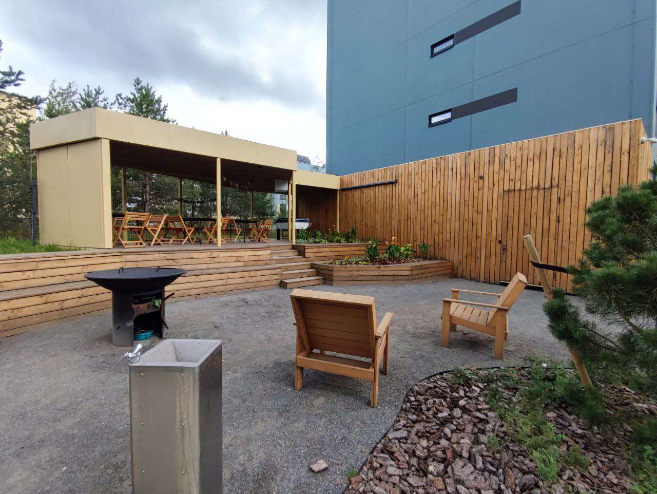 На первом этаже дома оборудованы удобные вспомогательные помещения: комната для мытья лап домашних животных, колясочная, оригинальная чат-доска для общения соседей. Закрытый и благоустроенный двор, включающий в себя территорию двух домов, гарантирует безопасность и спокойствие, круглосуточное видеонаблюдение. Гостевая парковка расположена по внешнему периметру за шлагбаумом. Для маленьких жителей предусмотрены детские игровые площадки, для взрослых – уютные зоны отдыха с барбекю и проектором, велобоксы.