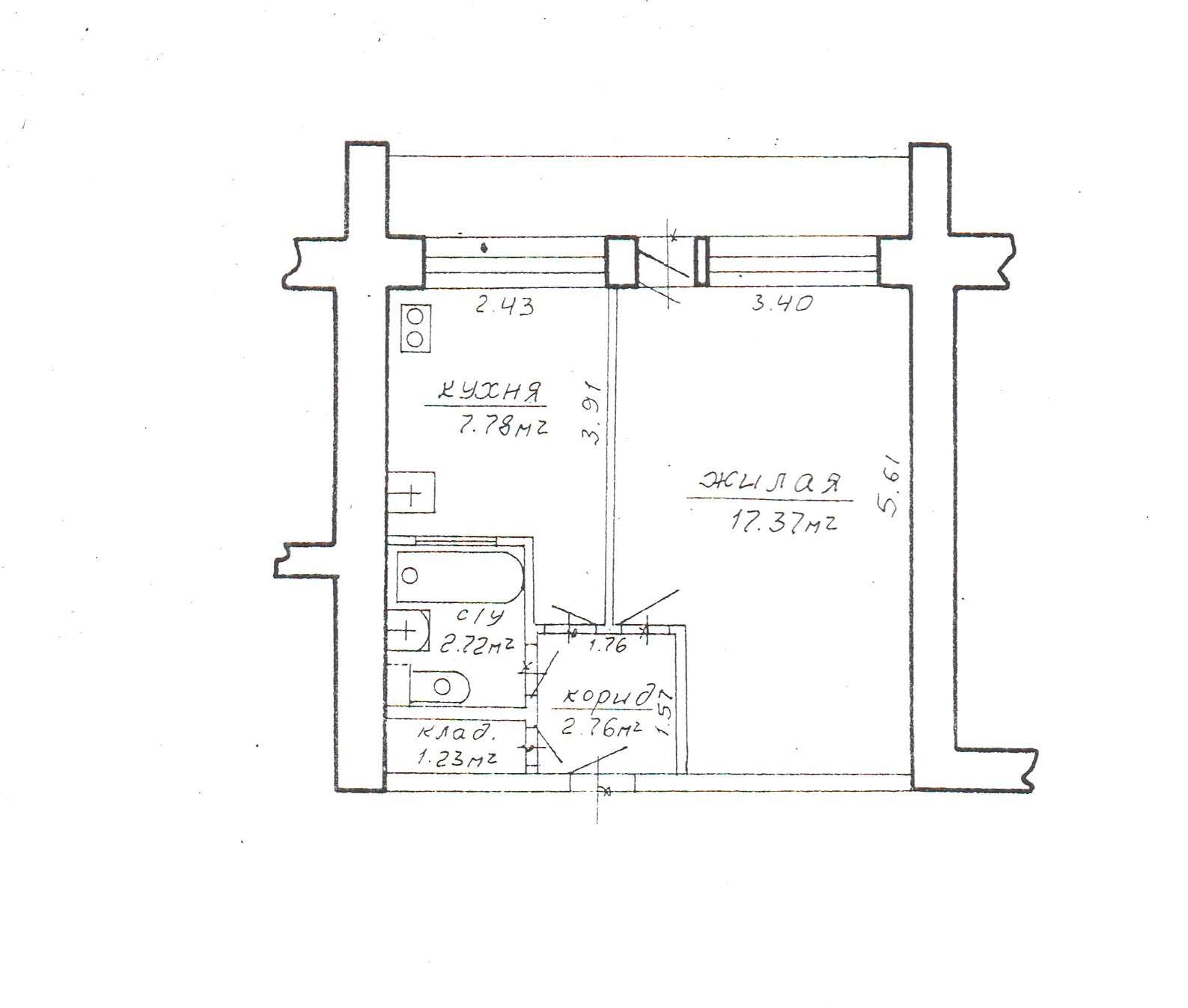 Общая площадь квартиры по СНБ – 35,8 кв. метров, общая- 31,9 кв. метров, жилая- 17,4 кв. метров , кухня-7,8 кв. метров.