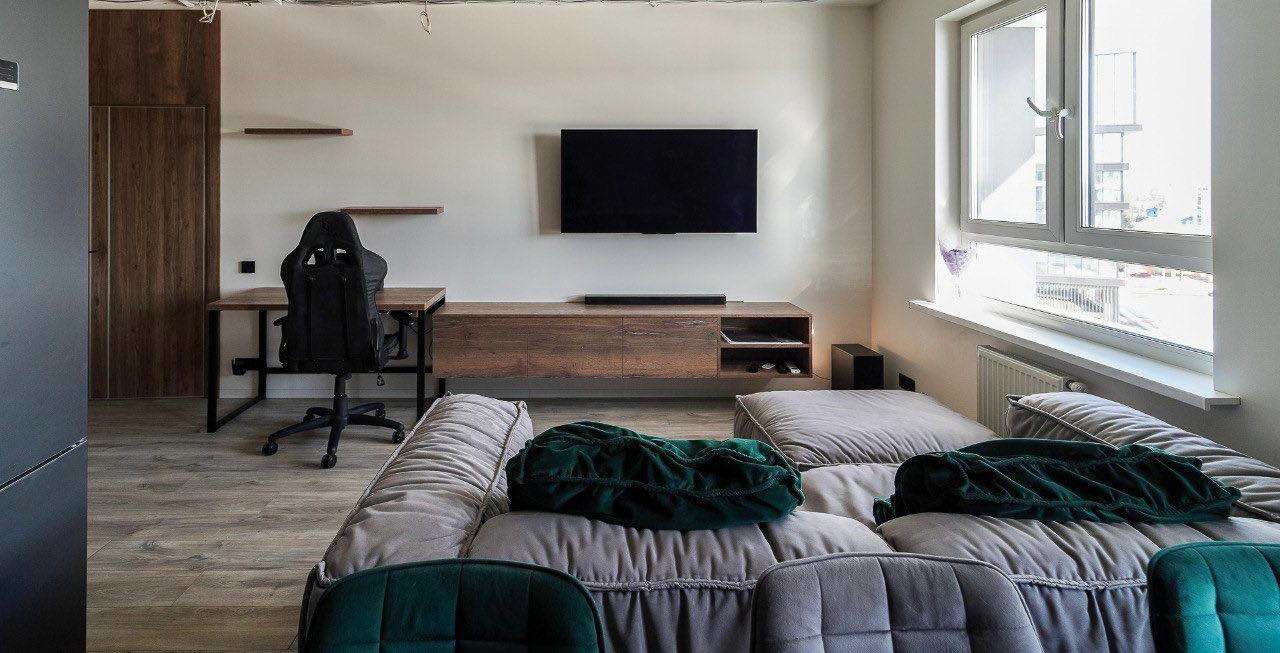 Лоджия выполнена под лаунж зону с кальянной, оборудована спальным местом, есть небольшой козырек на фасаде, который после 12 часов сдерживает активные лучи солнца.
