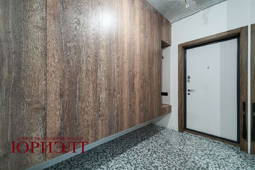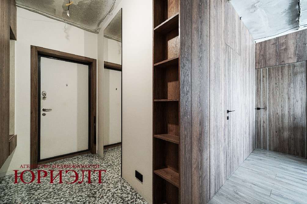 В прихожей дорогая итальянская широкоформатная плитка, зеркало в пол с подсветкой, парящие шкафы,