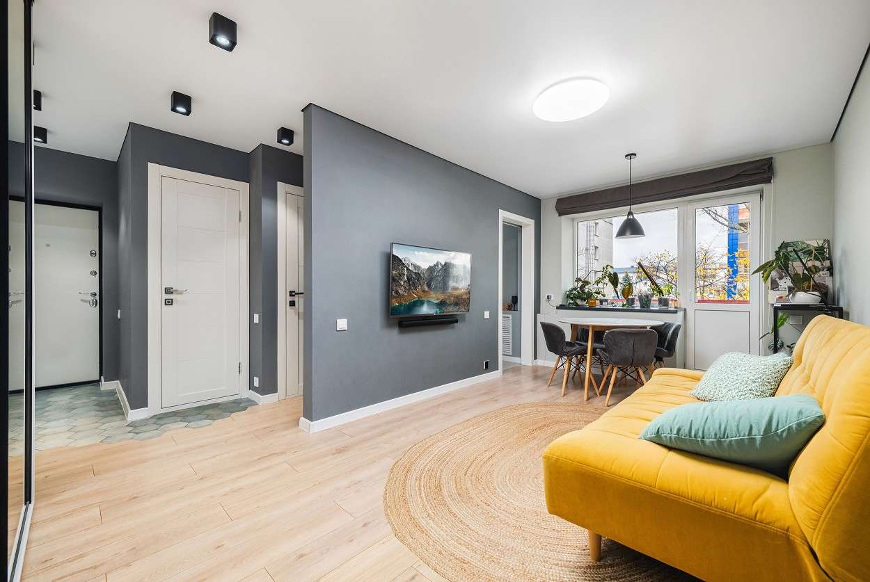 - Стены отштукатурены и покрашены безвоздушным методом, качественной финской краской с супер гладкой структурой. У входа уложена стильная итальянская плитка, а по всей квартире качественный немецкий ламинат;