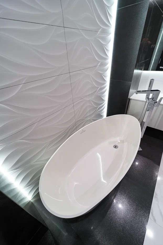 На кухне и в санузле - цельная столешница из искусственного камня без шва.