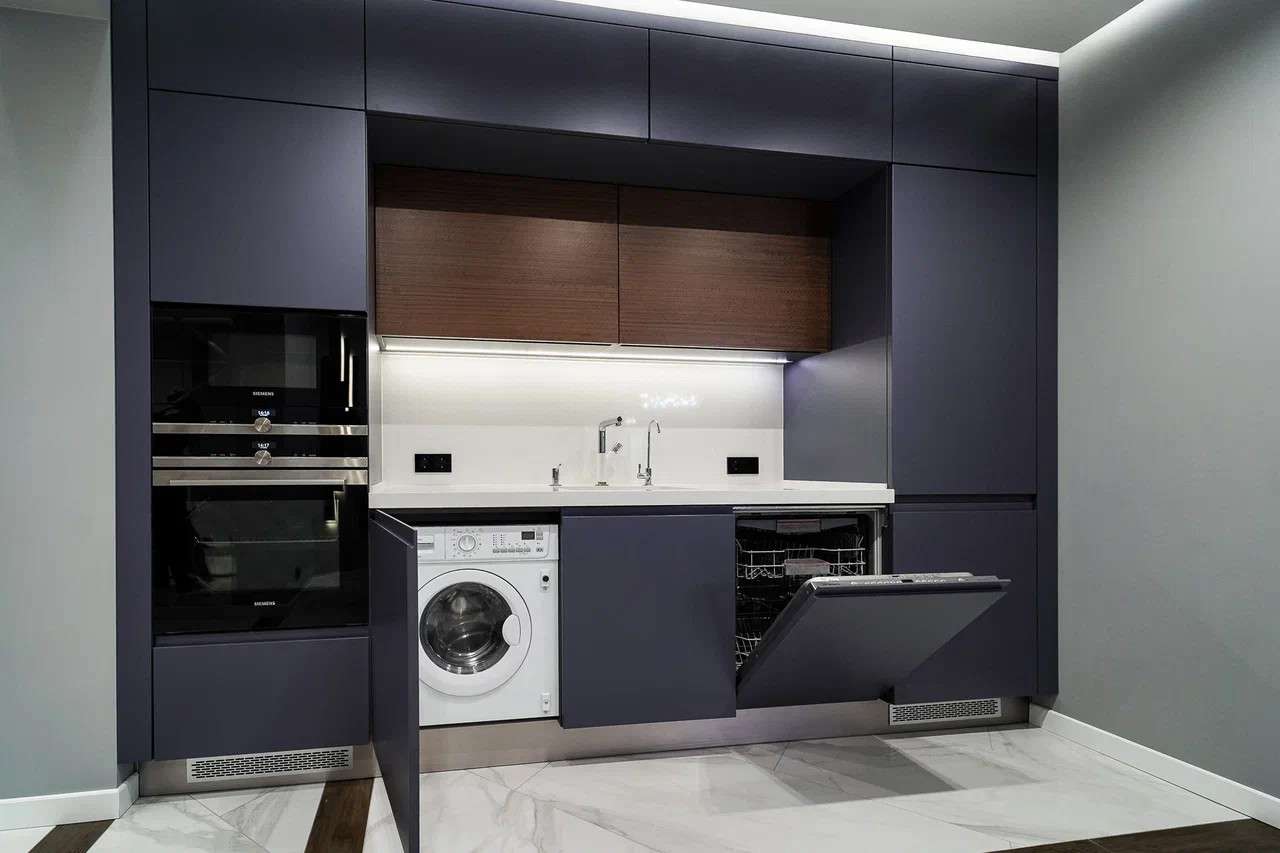 Встроенная бытовая техника: абсолютно новый холодильник Liebherr, большая посудомоечная машина Bosch, индукционная варочная панель Bosch, микроволновая печь и духовой шкаф Siemens, стиральная-сушильная машина Electrolux, водный фильтр, вытяжка Elica.