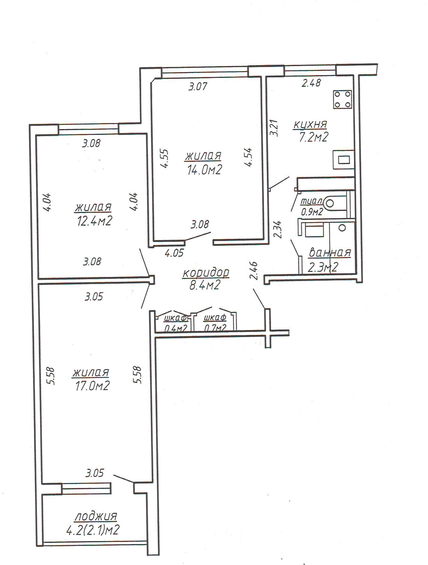Квартира находится на 5 этаже 9-этажного панельного дома 1983 года постройки. Общая площадь составляет по СНБ 65.4 кв.м, общая площадь 63.3 кв.м., жилая – 43.4 кв.м, кухня – 7.2 кв.м. Изолированные комнаты, раздельный санузел и наличие лоджии.