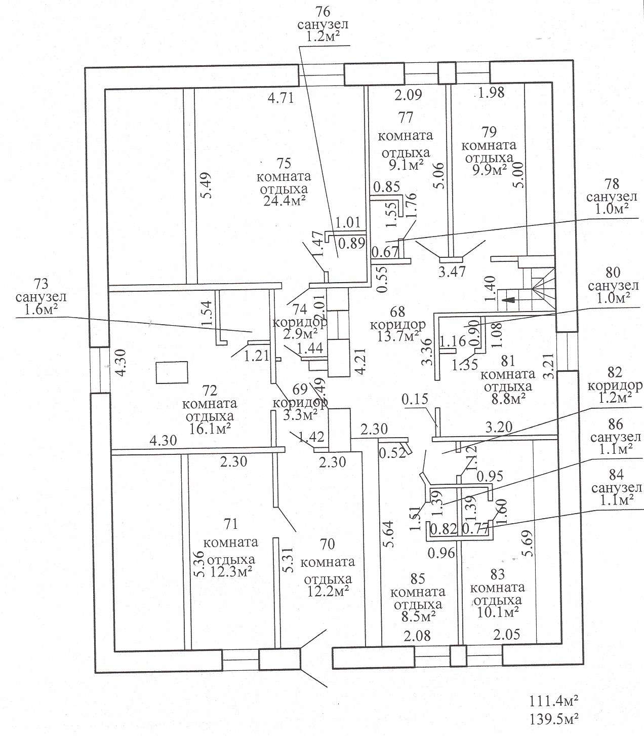 · 3-ый этаж: комната отдыха (количество – 9 единиц), санузел (количество – 6 единиц). Общая площадь – 139,5 м2, жилая – 111,4 м2.