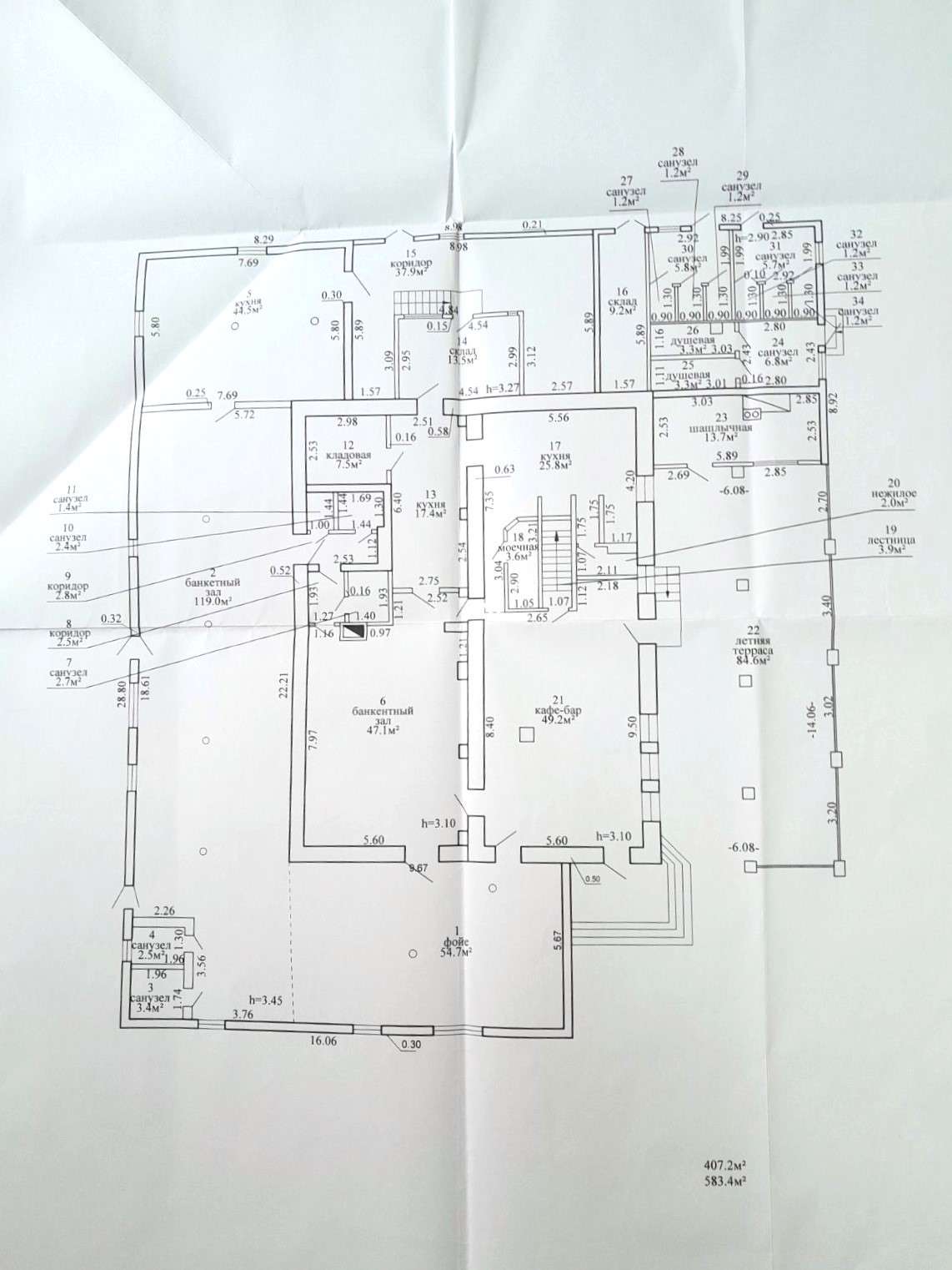 · 1-ый этаж: кафе-бар, банкетный зал, летняя терраса, шашлычная, склад, кухни, санузлы, душевые. Общая площадь – 583,4 м2, жилая – 407,2 м2;