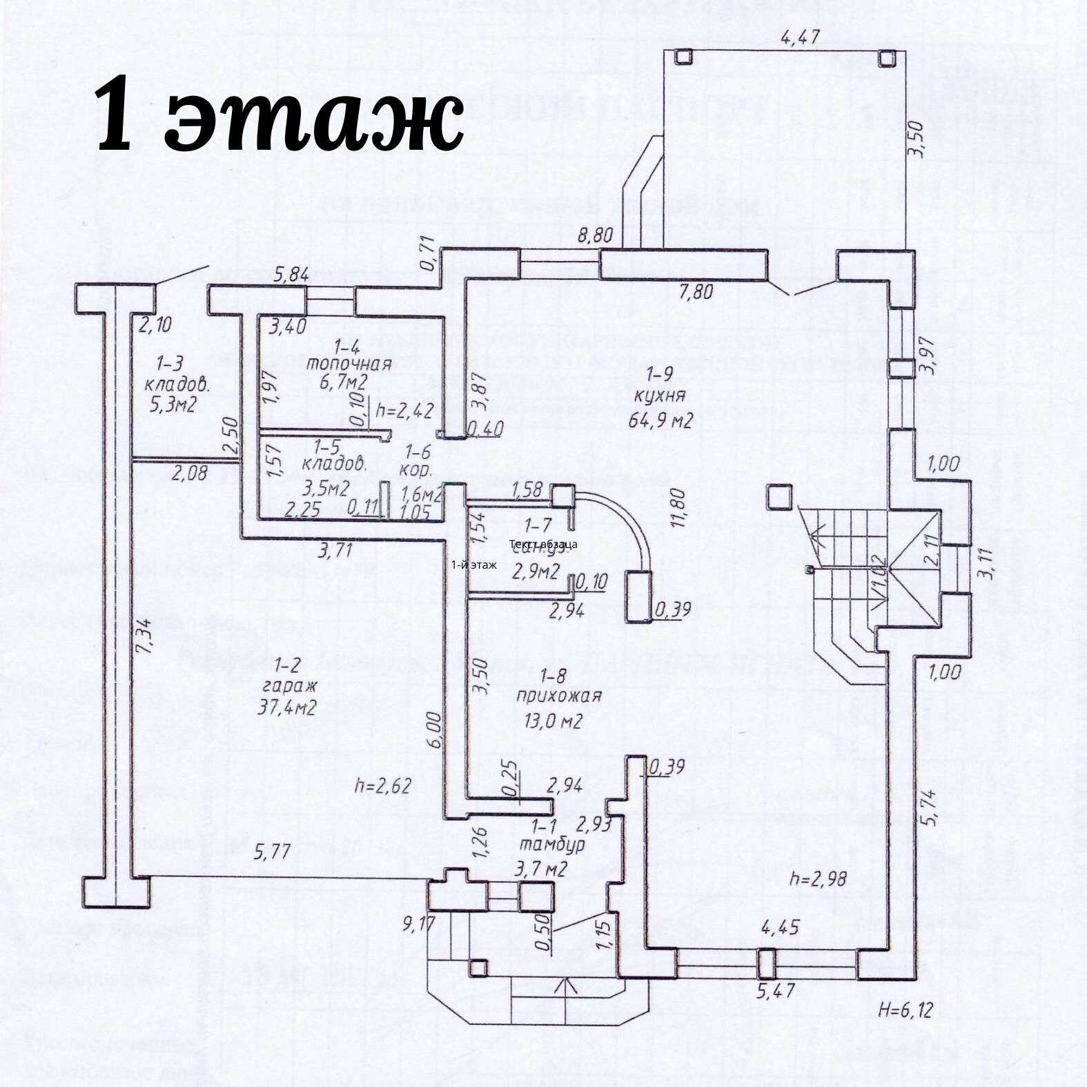 1-й этаж: кухня-гостиная 64.9 м2, со встроенной кухней. С выходом во внутренний двор с теневым навесом. Пол плитка. Возможность установки камина (выведен дымоходный канал).