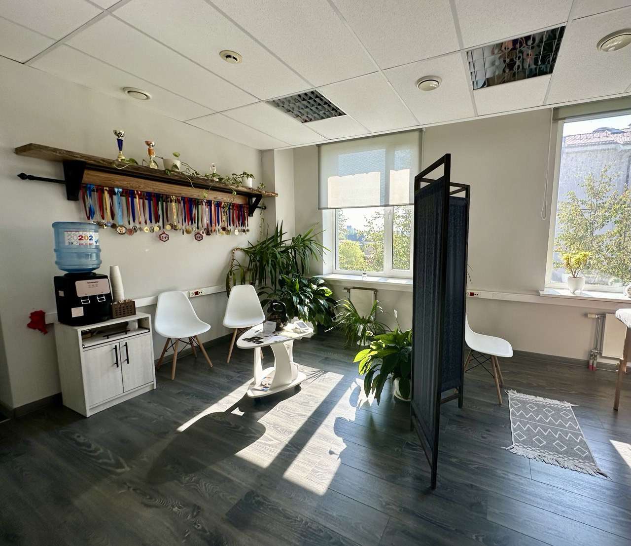 Просторный коридор, кабинеты, приемная, залы переговоров, кладовые, демонстративный зал, сервисная, два сан узла.